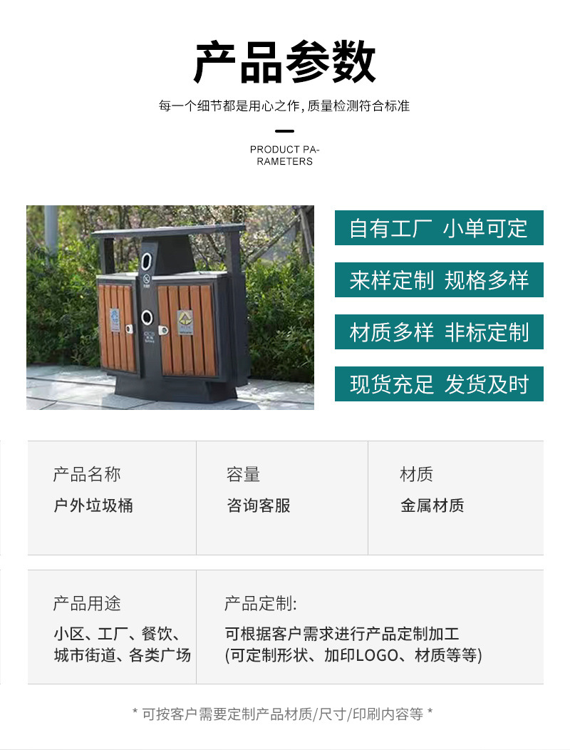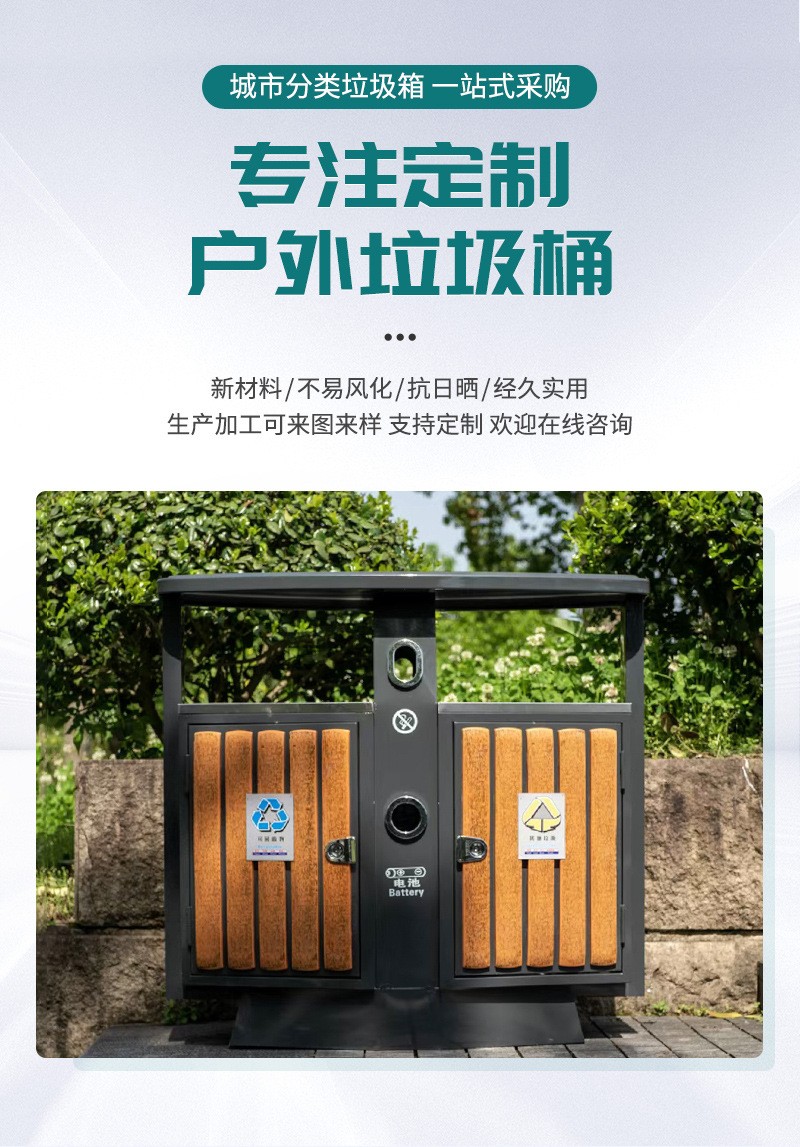 鍍鋅板分類戶外垃圾箱 公園小區(qū)室外雙桶垃圾桶 大號(hào)景區(qū)垃圾桶適用于小區(qū)、工廠、餐飲、城市街道、各類廣場(chǎng)、企業(yè)單位、花園、公園、學(xué)校、碼頭、風(fēng)景旅游區(qū)等公共場(chǎng)所,可按客戶的需要定投產(chǎn)品尺寸、材質(zhì)和印刷內(nèi)容